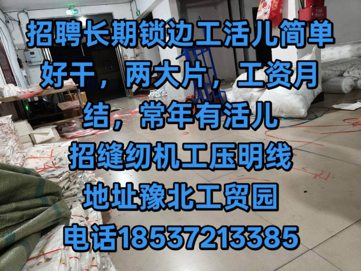 招聘长期,临时,锁边工活儿简单好干,两大片,工资月结,常年有活儿 地...